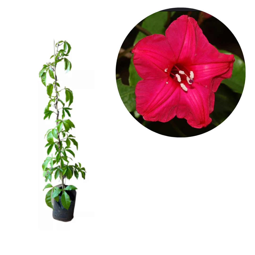 A ipomeia rubra é uma trepadeira de vida perene e de crescimento moderado, podendo atingir até 3 metros de altura.